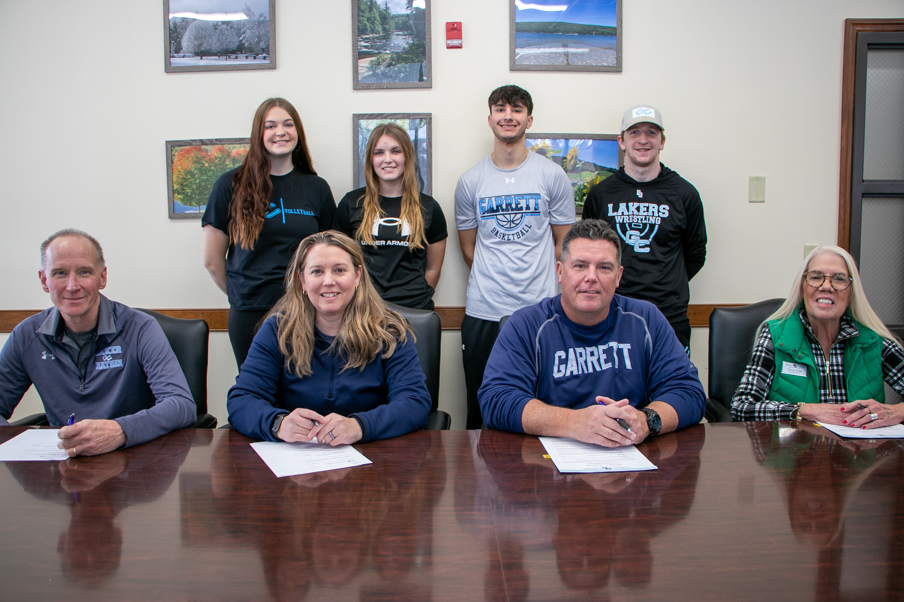 The Garrett College Foundation and Garrett College Department of Athletics created team-specific funds for the eight Laker intercollegiate programs. Pictured, left to right, are (back row) women's volleyball player Brenna L'Hommedieu, women's soccer player Sky Leasure, men's basketball player Gavin Jackson, wrestler Cole Stuchal, (front row) Garrett College President Dr. Richard Midcap, GC co-athletic directors Elizabeth Show and Eric Hallenbeck, and Garrett College Foundation Executive Director Cherie Krug.