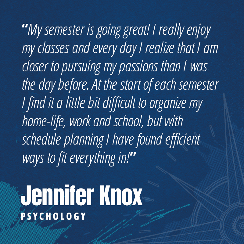 Answer: My semester is going great! I really enjoy my classes and every day I realize that I am closer to pursuing my passions than I was the day before. At the start of each semester I find it a little bit difficult to organize my home-life, work and school, but with schedule planning I have found efficient ways to fit everything in!